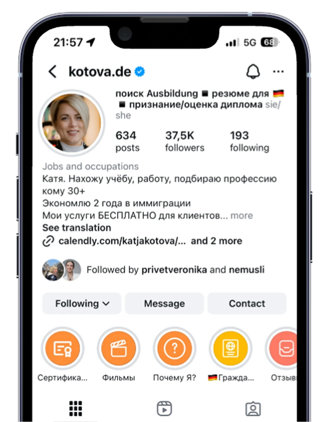 Чтобы получить мои услуги по поиску работы, учебы, составлению профессиональных документов, профиориентации и помоши в признании диплома БЕСПЛАТНО, вам необходимо получить ваучер от Jobcenter oder Agentur für Arbeit (Aktivierungs- und Vermittlungsgutschein)